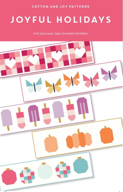 The Joyful Holidays Table Runners pattern celebrates the seasons with five modern table runner designs. All table runners are beginner friendly and use traditional piecing.