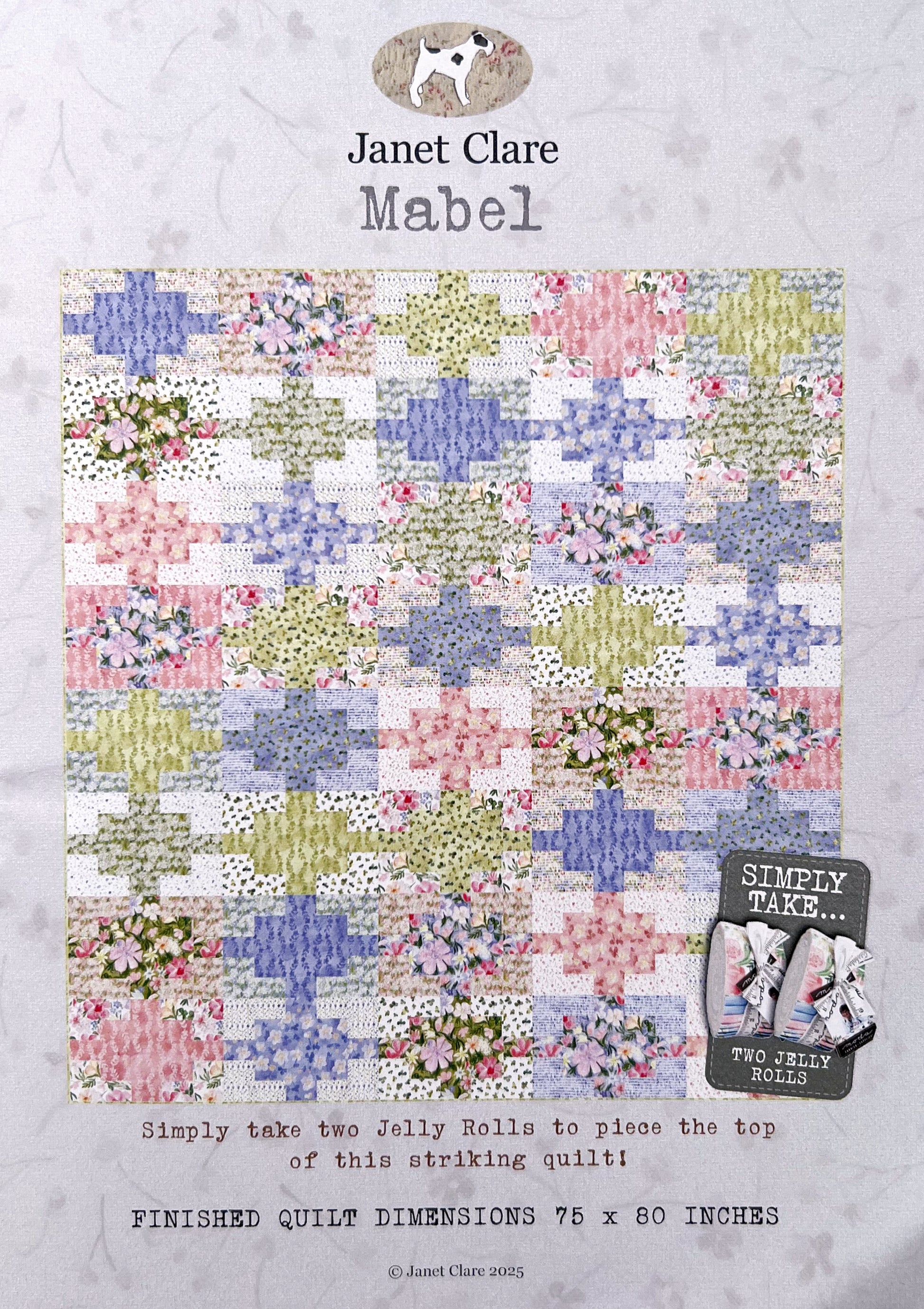 The Mabel quilt, designed by Janet Clare, is a quick and easy pattern that uses precut 2.5" fabric strips. One jelly roll (pack of 40 2.5-inch strips) makes a 50" x 60" quilt; two jelly rolls make a 75" x 80" quilt.