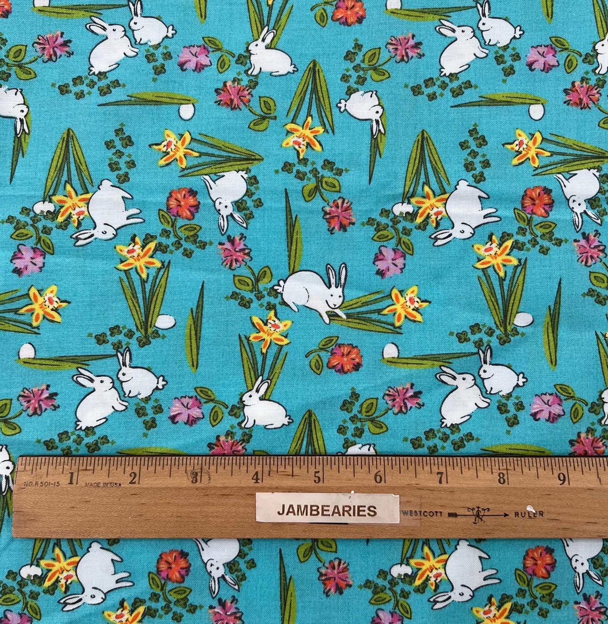 REMNANT 1 Yard 34" of Easter Bunnies on Blue Floral Fabric, Connecting Threads